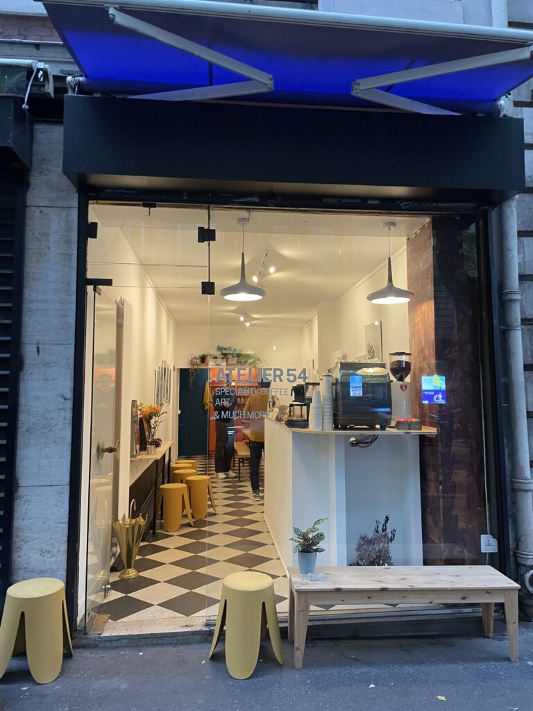 J’ai découvert ce coffee shop en me baladant au hasard dans le quartier Lamarck-Jules Joffrin. Un simple affichage annonçait du « coffee shop Atelier 54 – Brésil Rwanda ».